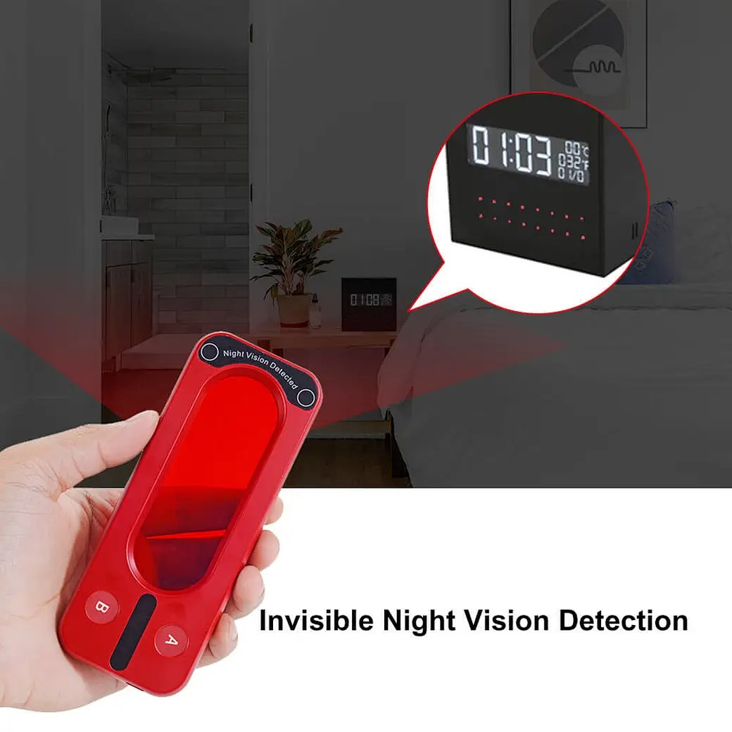 Este detector de cámaras ocultas protege tu privacidad al localizar dispositivos de vigilancia no autorizados. Detecta eficazmente lentes ocultas y luces infrarrojas invisibles utilizadas para visión nocturna.